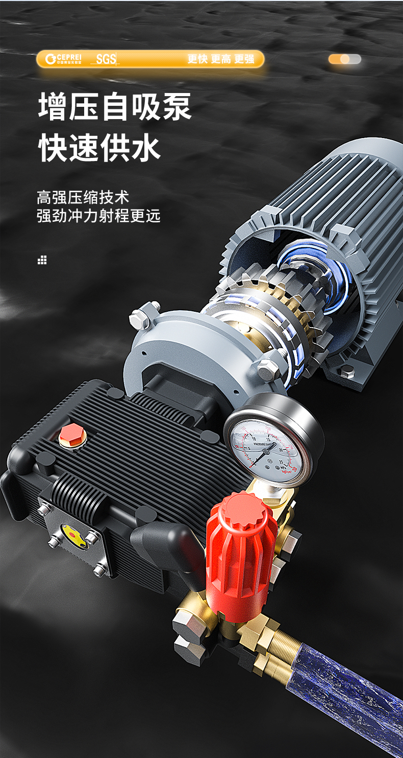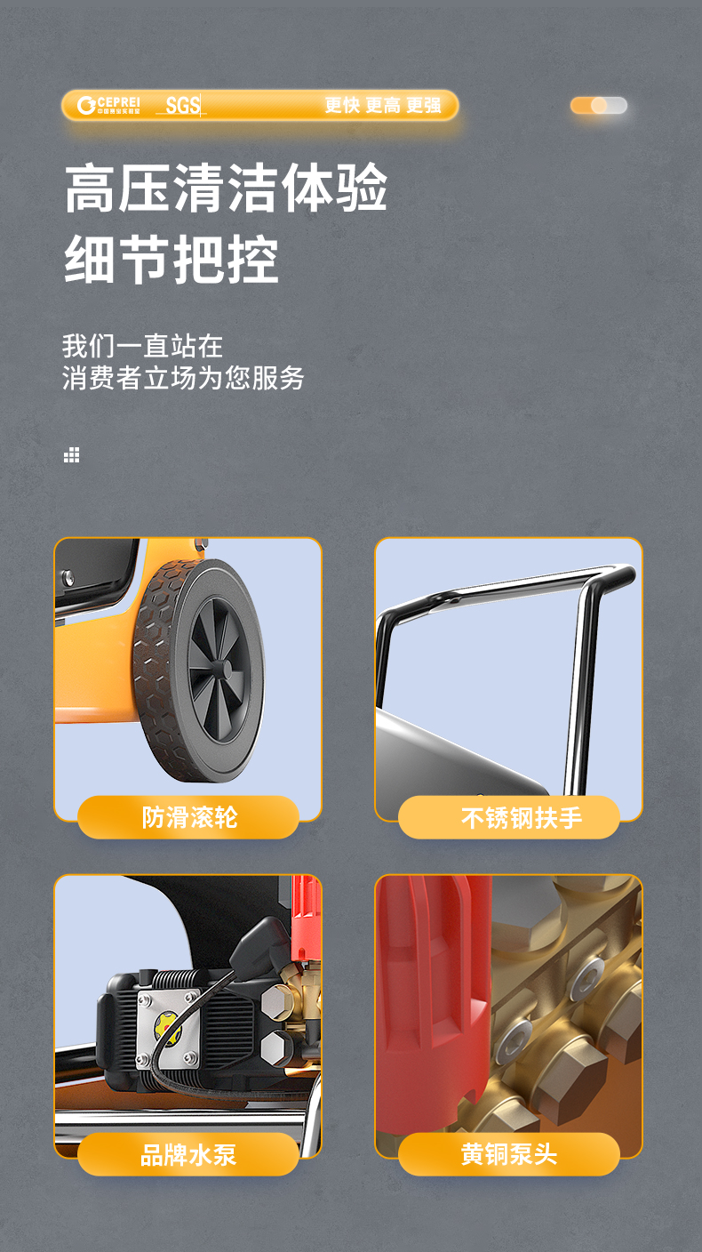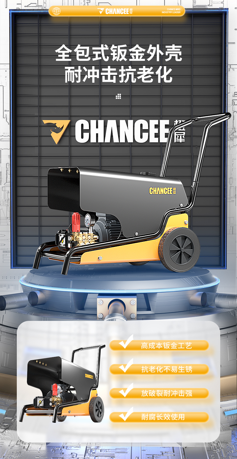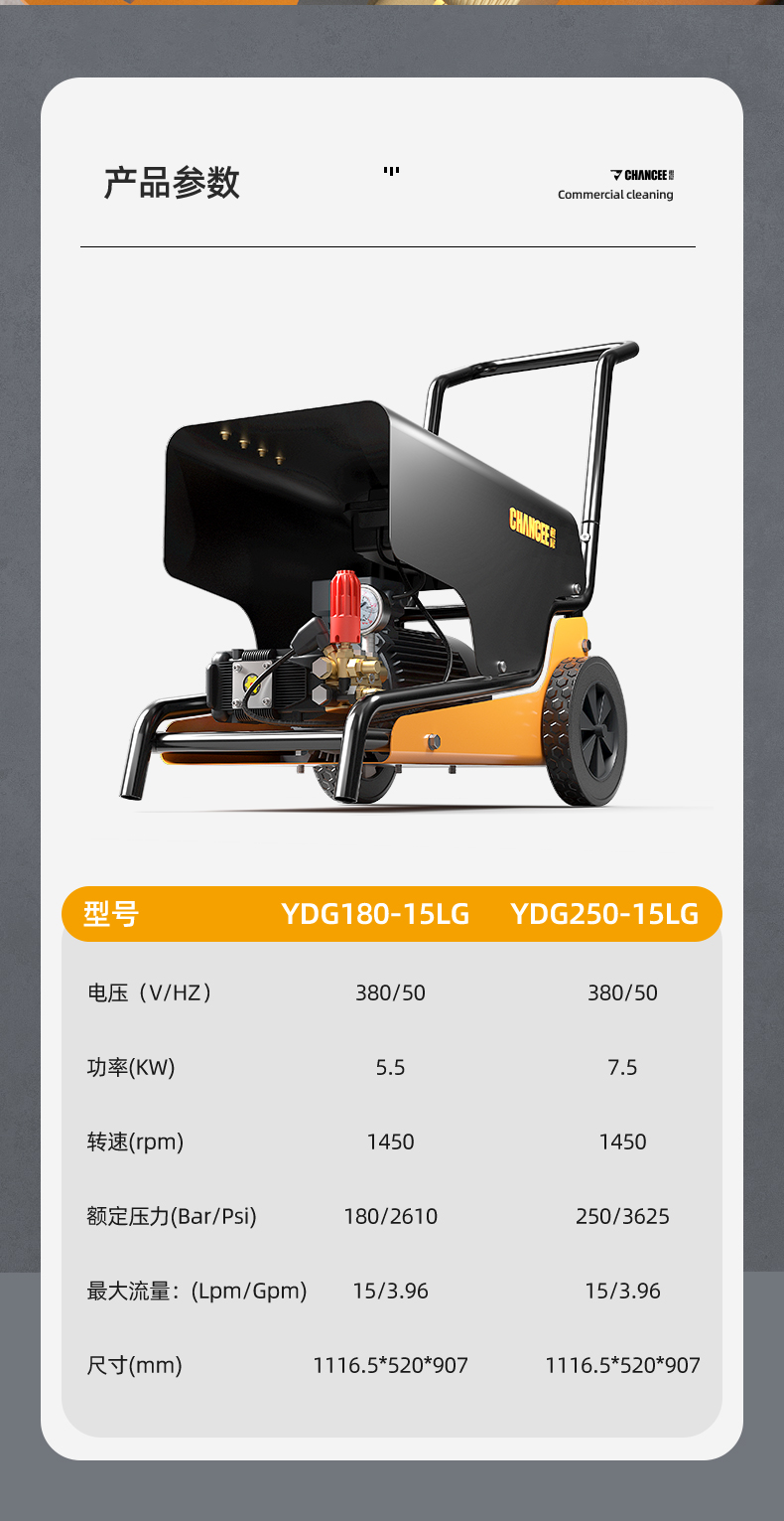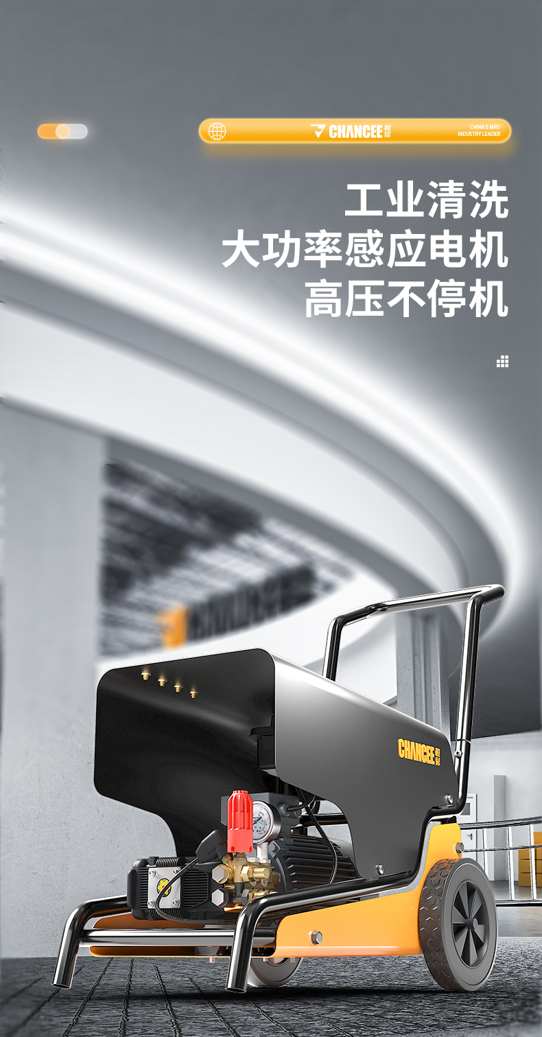 橙犀高壓清洗機 YG1815:工業清潔,大功率電機清潔高效率,防破裂耐沖擊強,耐腐蝕長效使用,還有智能高溫斷電設計,可視化調節省時省水。