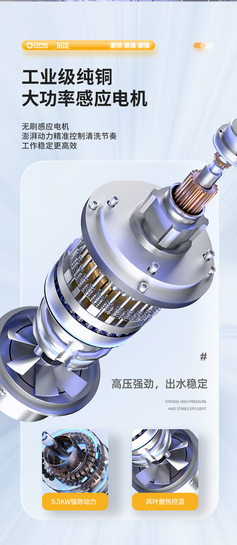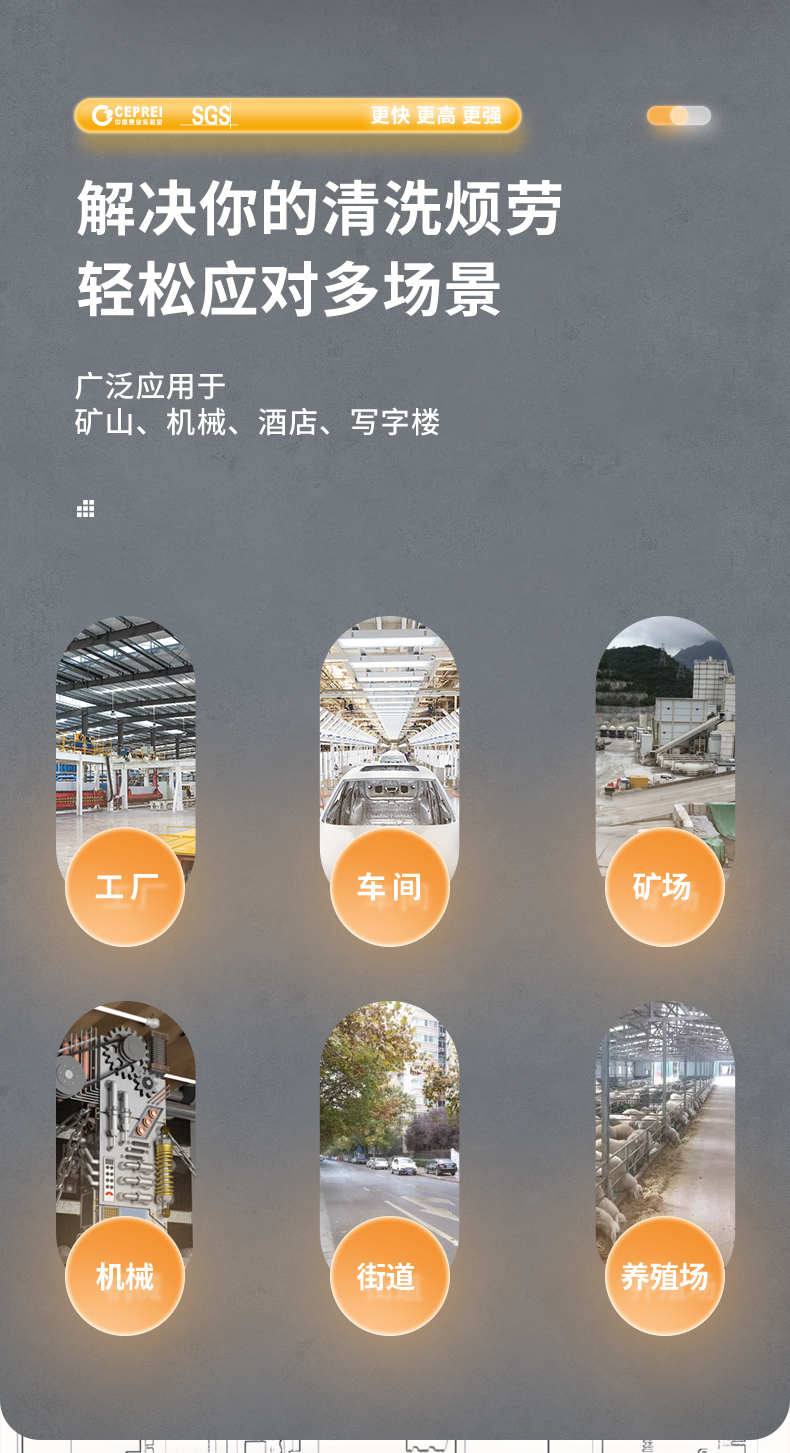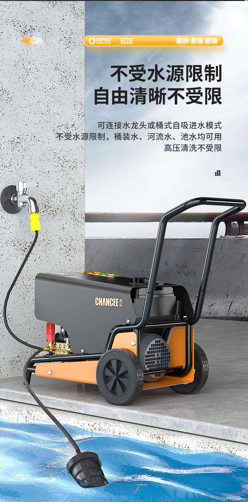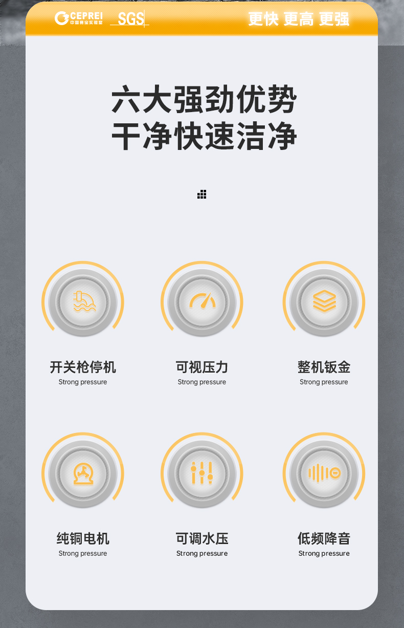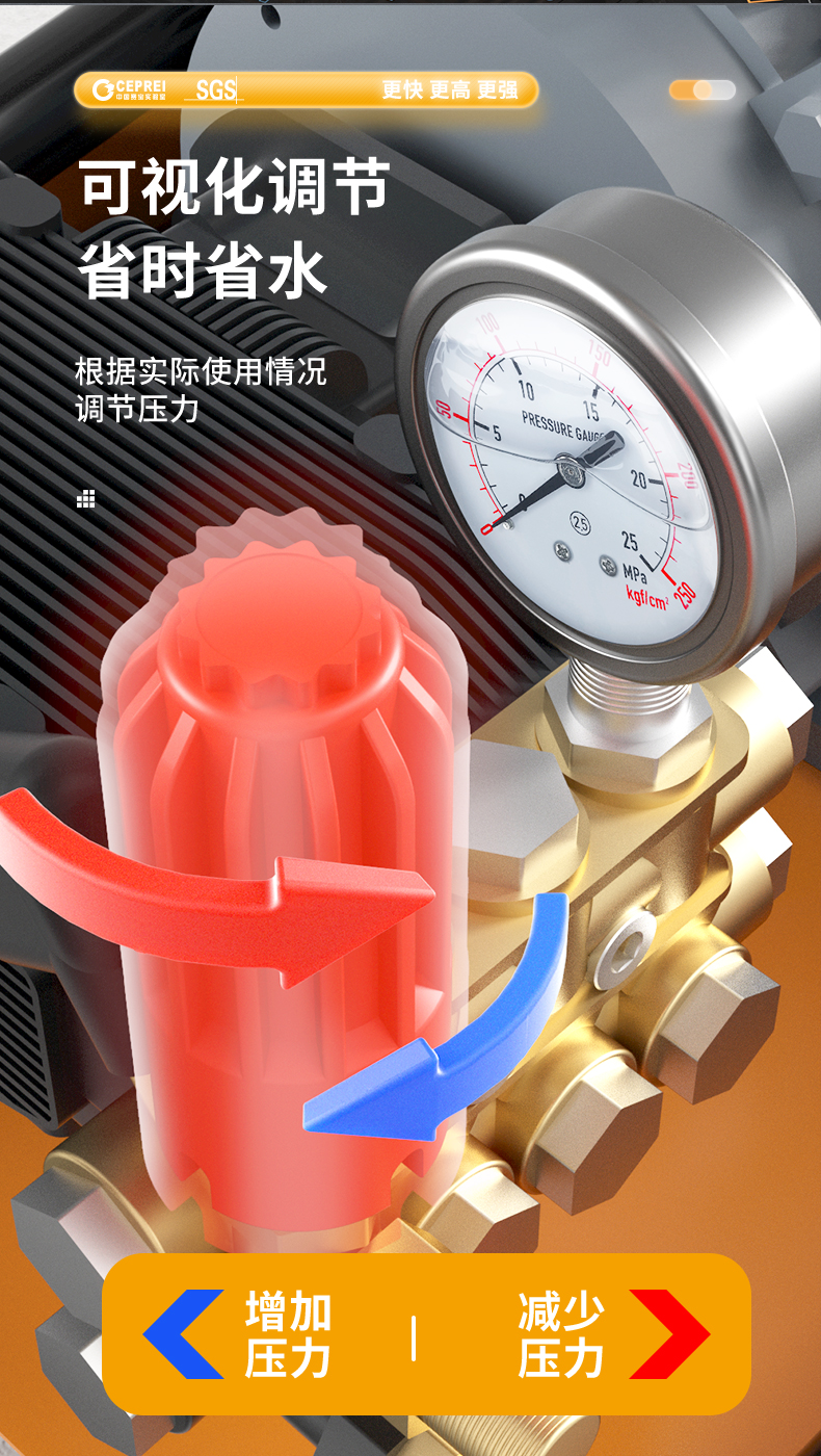 橙犀高壓清洗機 YG1815:工業清潔,大功率電機清潔高效率,防破裂耐沖擊強,耐腐蝕長效使用,還有智能高溫斷電設計,可視化調節省時省水。