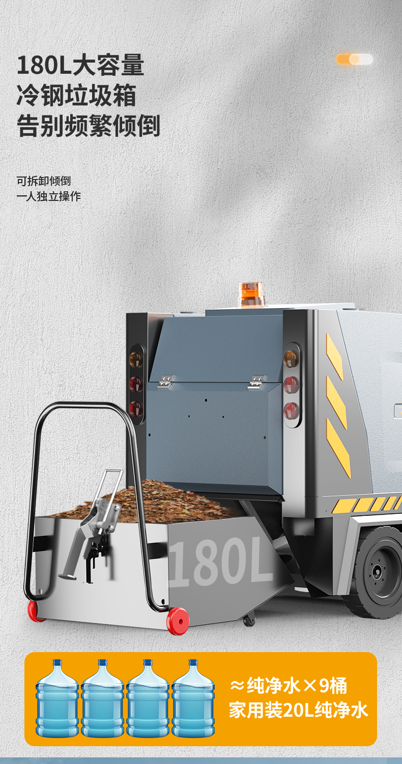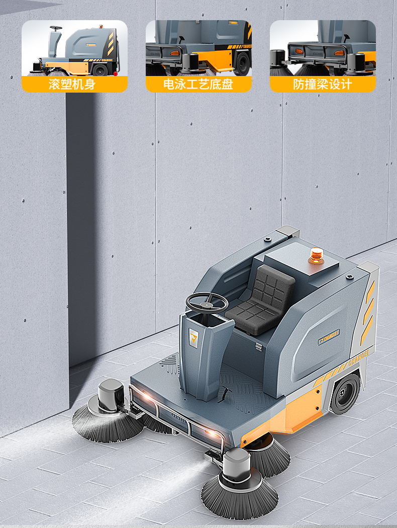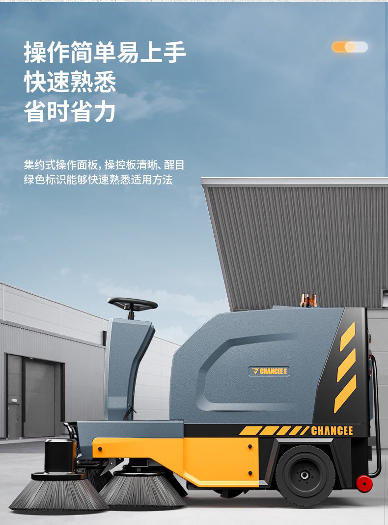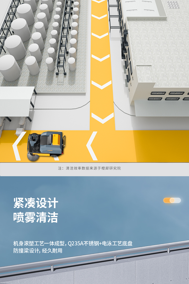 橙犀U190 駕駛式掃地機:1臺約比10人強,是1萬平方米左右場地清潔性價比之選。擁有1萬㎡清潔效率,180L塵集箱,四刷聚塵,邊刷放撞自動復位功能。