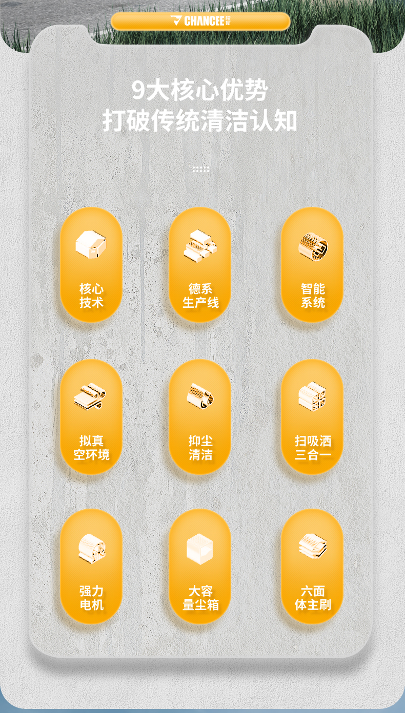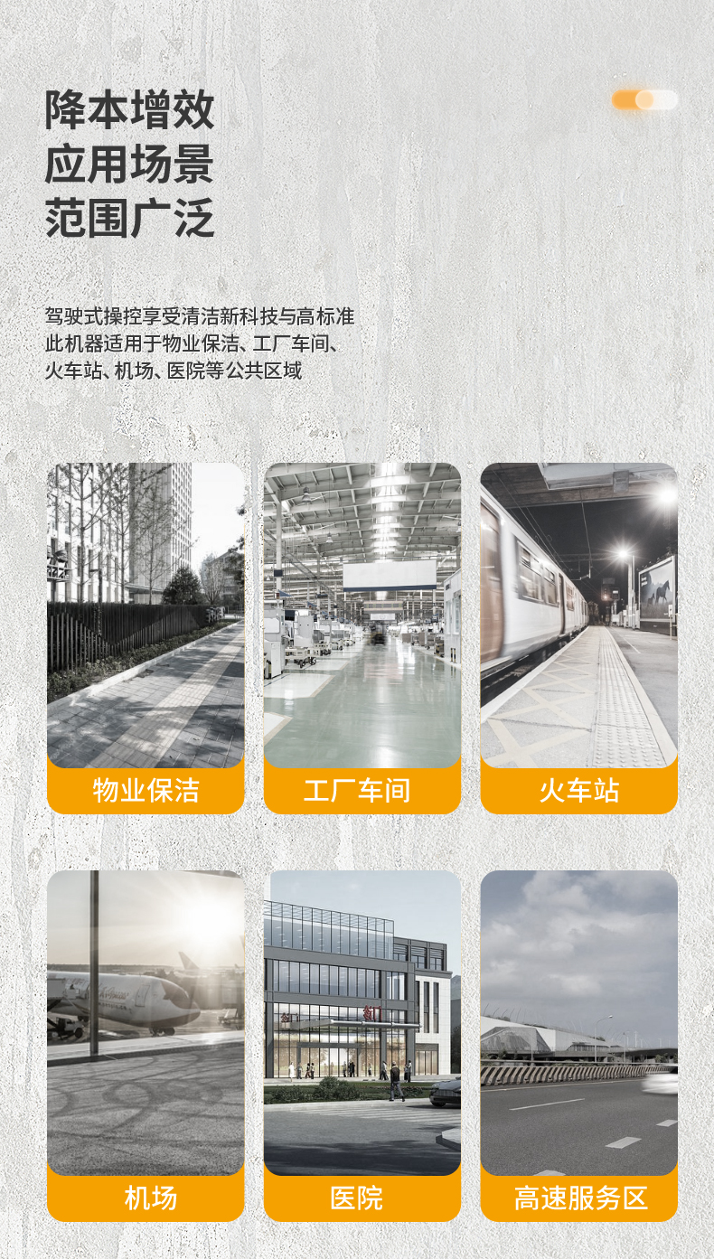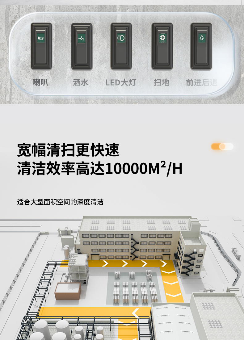 橙犀U190 駕駛式掃地機:1臺約比10人強,是1萬平方米左右場地清潔性價比之選。擁有1萬㎡清潔效率,180L塵集箱,四刷聚塵,邊刷放撞自動復位功能。
